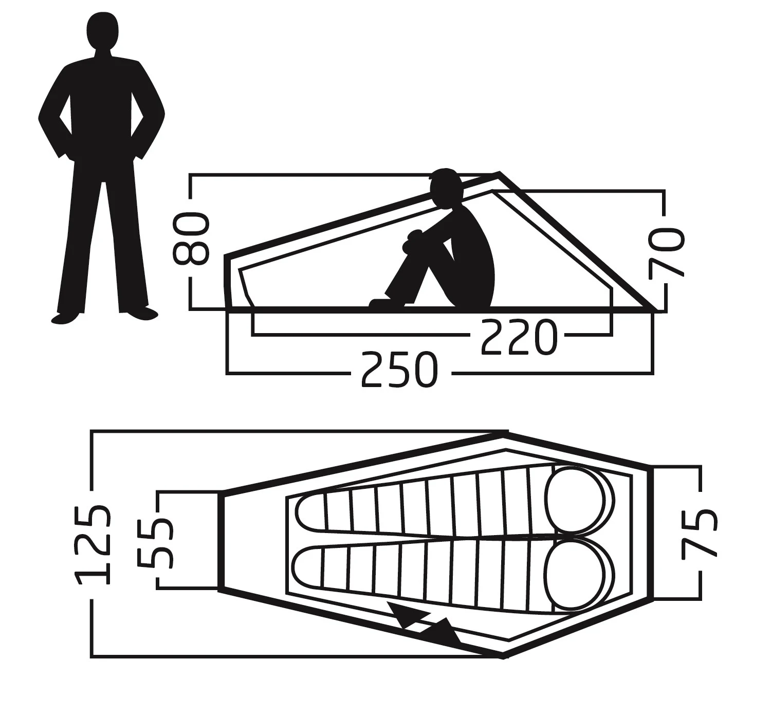 - Innenzelt: Länge ca. 220 cm · Breite ca. 120 cm · Höhe ca. 70 cm