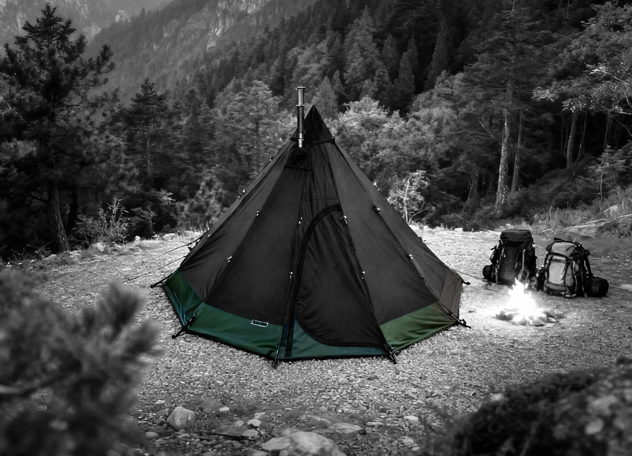 Das W23© Tactical Tipi 002 ist die taktische Versionrobustem schwarzem Canvas mit integriertem 500D Cordura®-Boden, Notausgang und feuerfester Kaminabdeckung. Entwickelt für Bushcraft-, Survival- und Militäreinsätze ebenso wie für Expeditionen und Wintertouren.